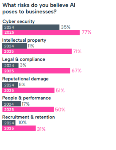 In fact, our survey found that legal compliance was a much bigger concern for business owners in 2025 than in 2024, with 67% of businesses now stating this as a risk AI poses to their business. A further 50% were also worried about reputational damage. Below, our graph shows the exact data: