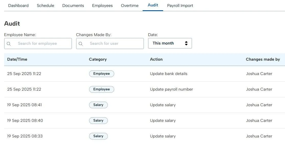 When you add an employee or "Sync" them to Payroll, this information is logged in your audit which will include the details of when it happened, who made the change, what the change was (i.e salary details, name change etc.), any absence details such as sickness and even any overtime recorded for payment.