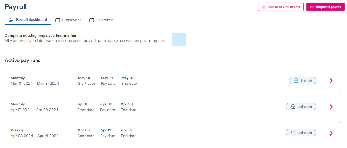 First things first. From within your BrightHR account, head over to the payroll section and click 'BrightHR Payroll' to get started.