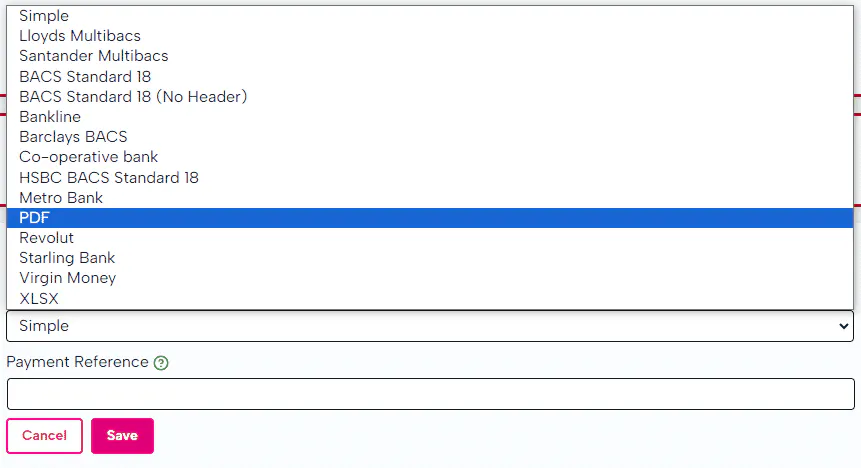 Payment File Settings - select the payment file template you wish to use, followed by the payment reference that you wish to be visible to the employees on the transaction.
