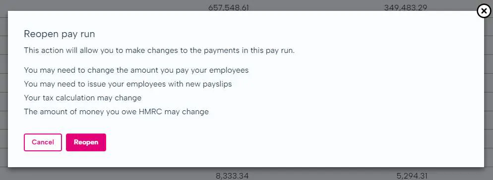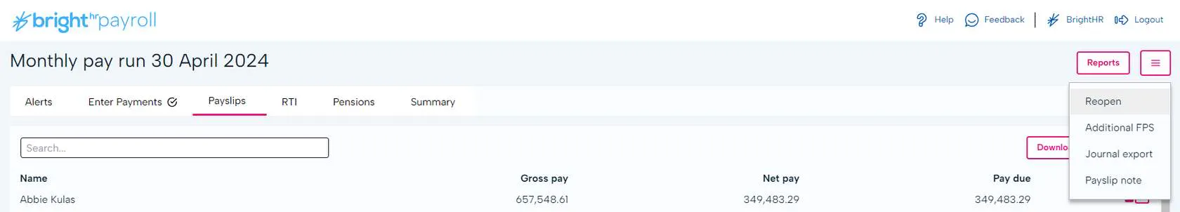 If you need to send another report to HMRC to correct the original, BrightHR Payroll will let you do this in a few simple steps. First, you will need to reopen your pay run. To do this, head to the pay run you need to re-submit and select the 'Reopen' option from the menu in the top right.