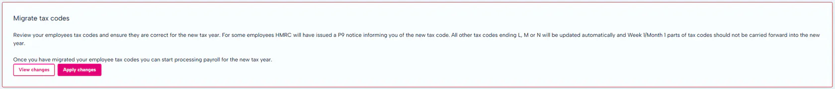 Sometimes HMRC issues a P9 tax code notice for an employee where there is a difference from the current year. For example, an employee may have been on a lower tax code but for the new year will be on the standard tax code.