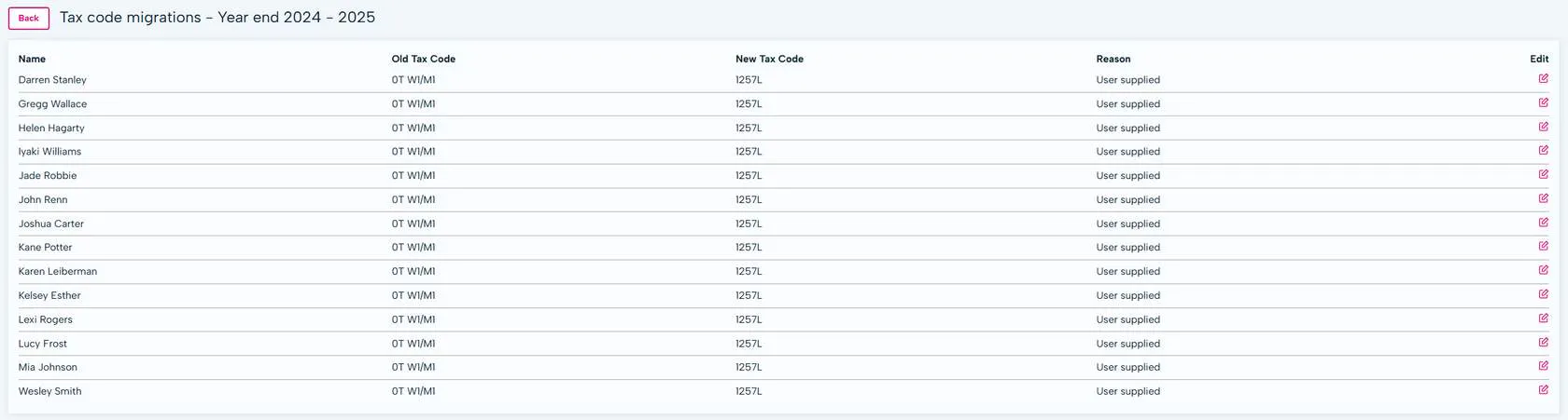 For the start of a new tax year, tax codes are changed and the W1/M1 flag needs to be removed. Here is where you will make the changes and apply them to your employees in one go.