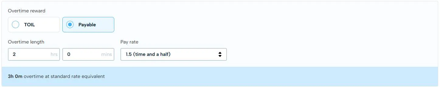 You can also select the pay rate for payable overtime, whether normal time, half time, double time etc. which will increase the number of hours for the overtime length to reflect this in their pay.