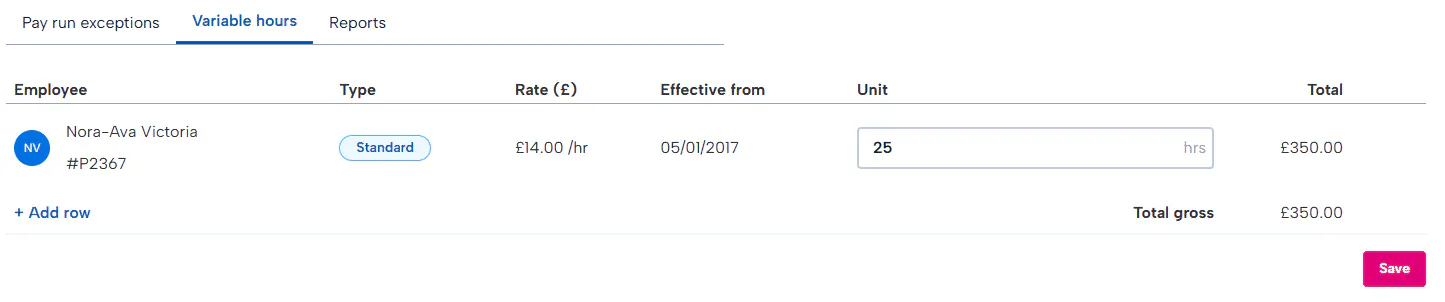 You can now start to add their working hours. Simply enter the number of hours they have worked over this pay period and the payroll engine will calculate based on their hourly rate on BrightHR.