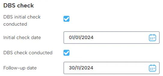 A DBS (Disclosure and Barring Service) initial date can be set and a follow-up date added. This can be found under the sensitive information section in the employment tab.