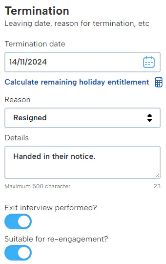 Termination is a date you can set for when the employee is set to leave. You will set a date which will immediately archive their profile after midnight for the date entered.