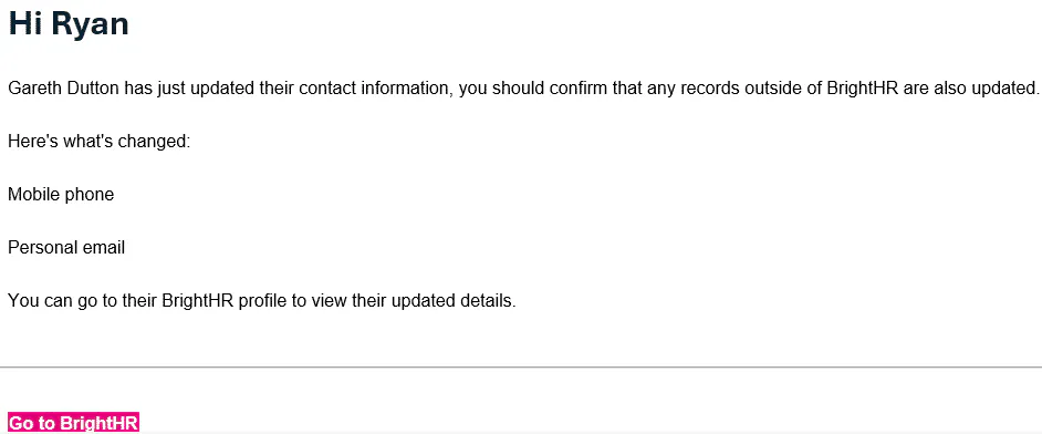 A notification is sent whenever an employee makes a change to their contact information or address details under the personal tab of their profile.