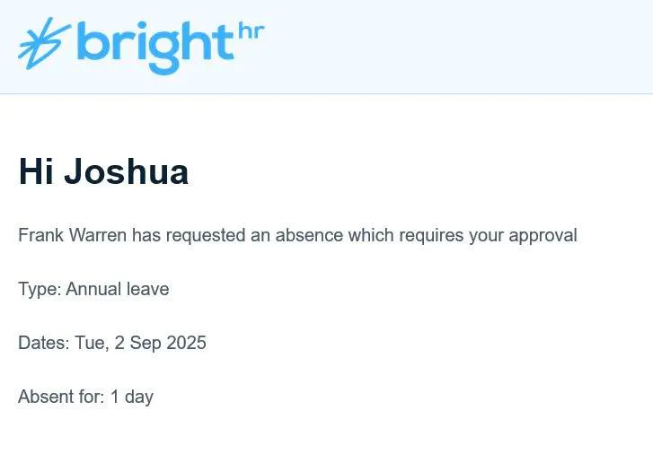 When an absence is requested or edited by an employee, a notification is sent to their manager and any admins. Additionally, the employee will receive an email confirming their absence request.
