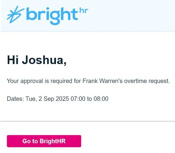 When overtime is requested by an employee, a notification is sent to their manager and any admins. Additionally, the employee will receive an email once their overtime request is approved / declined.