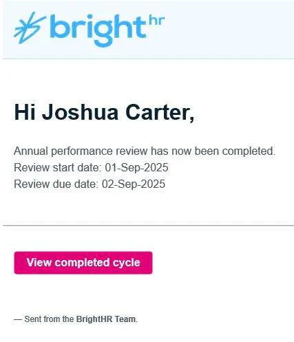 When a review cycle is added for one of your managers or even yourself, a notification will be sent to confirm it has been assigned. Once the review questions are complete for the manager, the employee will receive a notification and vice versa. Once the review has then been completed by the manager, a notification will be sent to the admin who created the cycle as well as the employee.