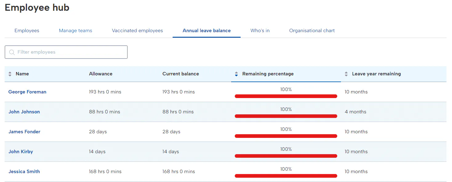 - A breakdown of how long of the leave year is left in months to give you an idea of how much leave your staff have taken or need to take.