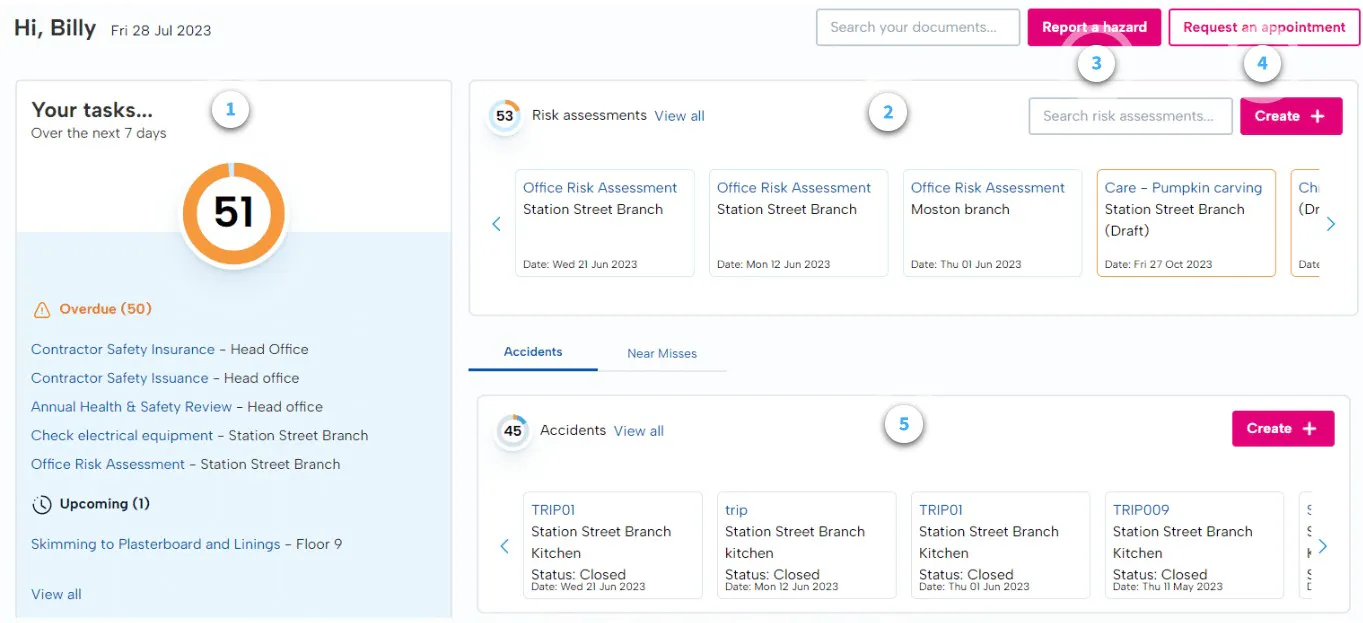 When you log in to BrightSafe the first thing you'll see is your dashboard, this gives you a handy breakdown of any key H&S information and tasks that are upcoming.